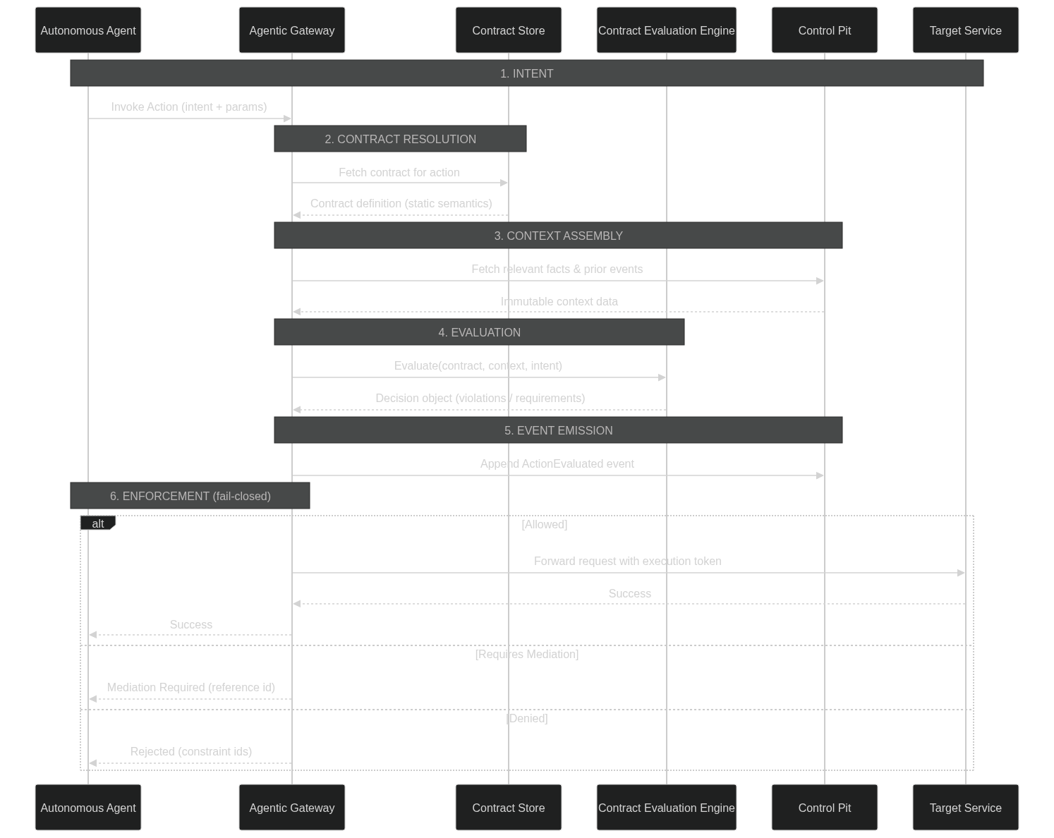 - Description: A deterministic, non-inferential engine. It is a “pure function,” meaning it performs no I/O itself. It receives the Intent, Contract, and Context as a single bundle and calculates the outcome. Because it is pure, it can be mathematically verified and is immune to side-effect bugs.